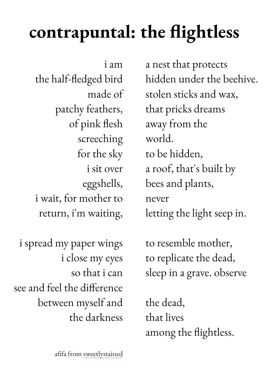 This was heavily inspired by a wonderful essay: the bird that never flew by meesh . She writes so beautifully.