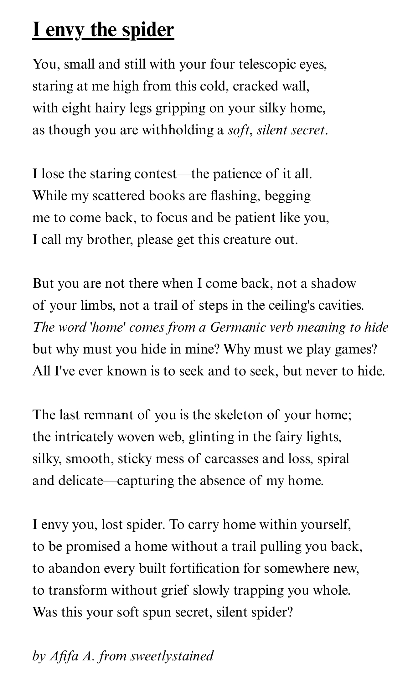 AHHHHH this was so amazing to read ! the spider and the analogy of home uuff. <3